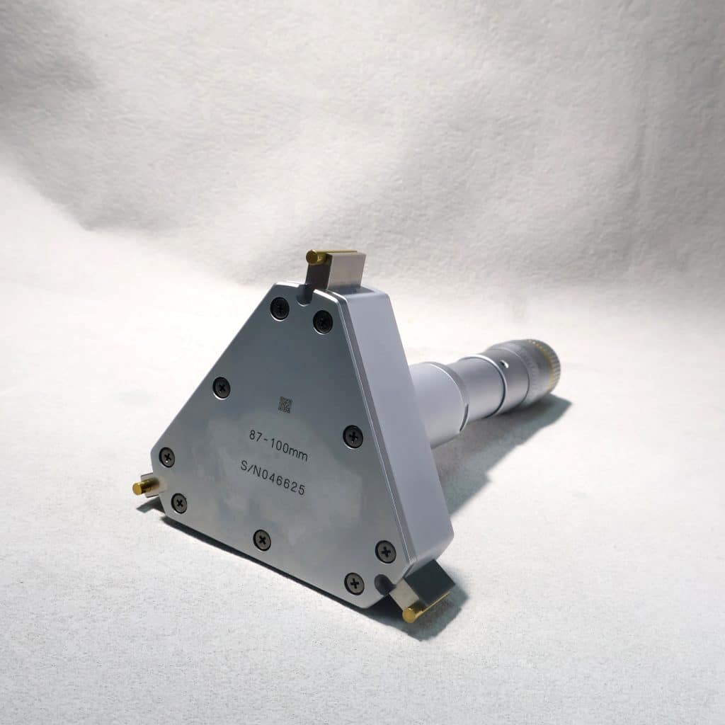 ミツトヨの三点式内側マイクロメータ368-173は、自社開発の高精度の微分スクリュを内部に採用しており、一回転あたりの送り量が極めて均一であるため、測爪の半径方向変位と目盛り読み値が完全に線形性を保ち、機械加工誤差とピッチ誤差をマイクロメートルレベルの公差範囲内に抑制している。